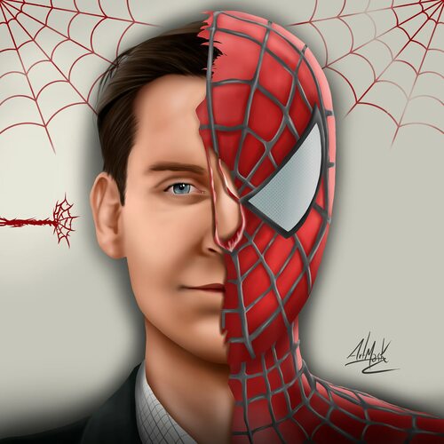 Третья фотография представляет собой стилизованный портрет человека паука. Здесь используются яркие цвета, а контуры персонажа становятся более абстрактными. Этот портрет показывает, как герой может быть представлен в разных художественных интерпретациях.
