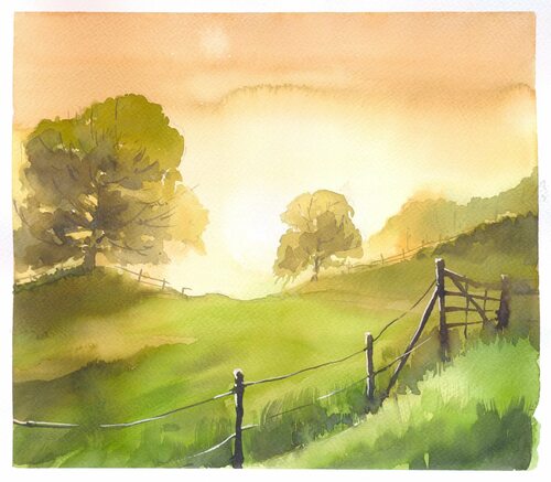 На этом рисунке изображено утро на озере. Вода спокойна и безмятежна, отражая яркие цвета неба. Рыба прыгает из воды, добавляя движения и динамики этому утреннему пейзажу.