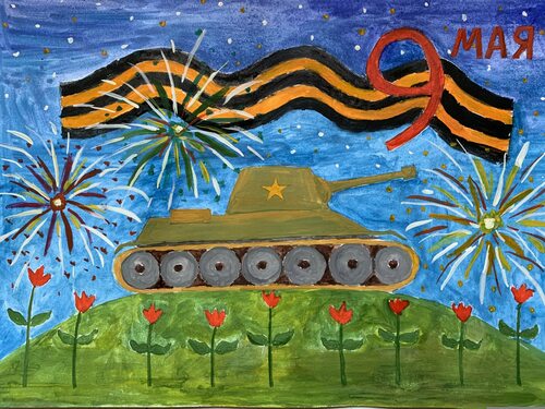 На этом рисунке видно, как салют освещает ночное небо и создает атмосферу торжества и победы. Дети смогли передать величие этого момента, используя глубокие цвета и детали.