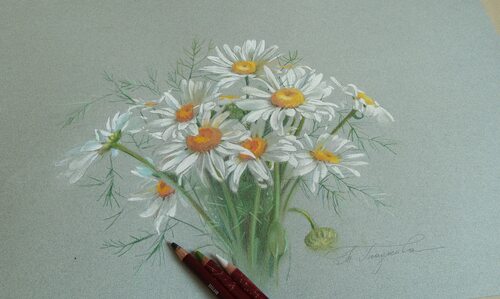 Когда ваш рисунок ромашек готов, не забудьте подписать его и закрепить защитным спреем, чтобы сохранить его на долгое время.