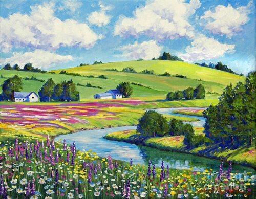 Вторая работа - это картина с цветочными полями. Гуашь позволила создать насыщенные оттенки цветов и передать всю красоту и радость, которую приносят нам летние цветы. Это настоящая праздничная картина, которая внесет свежесть и жизнь в любой интерьер.