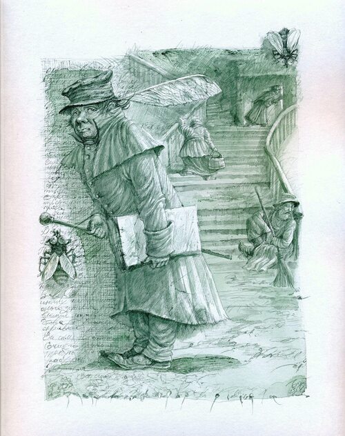 Вторая иллюстрация позволяет увидеть главного героя вне рабочей обстановки. На картине изображен городской пейзаж, по которому герой грустно прогуливается, одетый в свою знаменитую шинель.
