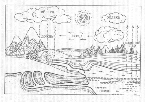 Часть воды, попавшей на землю, испаряется снова под воздействием солнечной энергии, и процесс круговорота воды начинается снова.
