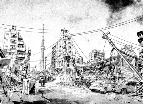 Затем добавьте дополнительные детали, такие как разрушенные здания, скатывающиеся скалы и пыль поднимающаяся из-за землетрясения.