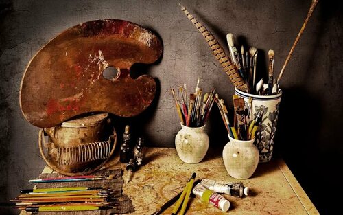Натюрморт с художественными принадлежностями - это композиция, в которой используются различные предметы и материалы, связанные с искусством. Это могут быть кисти и палитры, художественные инструменты, модели или скульптуры.