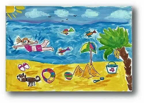 Ничто не олицетворяет лето лучше, чем солнечный пляж с пальмами и бирюзовым морем. Один взгляд на этот рисунок заставит вас сразу представить себя на таком пляже, наслаждаясь теплым солнцем и свежим морским бризом.
