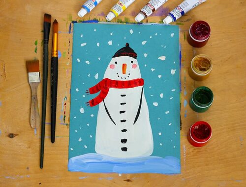 Используйте разные краски и кисти для создания деталей на снеговике, таких как шарф, шапка, кнопки и ветки для рук. Вы можете экспериментировать с цветами и стилями, чтобы создать уникальный и оригинальный рисунок.