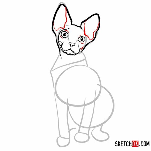 После того, как вы нарисовали контуры, перейдите к рисованию деталей лица сфинкса кошки, таких как глаза, нос и уши. Обратите внимание на особенности этой породы кошек, чтобы сделать рисунок максимально реалистичным.