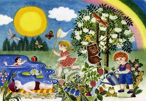Первая категория картин - летние пейзажи. Они отображают зеленые поля, яркие цветы, голубое небо и счастливых детей, играющих на улице. Взглянув на эти картины, дети смогут вообразить себя на месте героев и прочувствовать радость летнего дня.