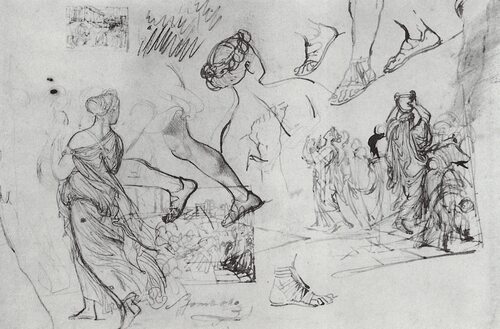 Карл Брюллов (1799-1852) - выдающийся русский художник-пейзажист и портретист. Он известен своими набросками, которые являются предварительными эскизами для его известных картин. Наброски Брюллова являются ценными произведениями искусства, демонстрирующими его мастерство и творческий процесс.