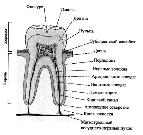 Зуб состоит из нескольких основных частей: коронки, шейки и корня. Коронка зуба видна над верхней челюстью и служит для разжевывания пищи. Шейка зуба соединяет коронку с корнем. Корень зуба находится внутри десны и служит для поддержки зуба в челюсти.